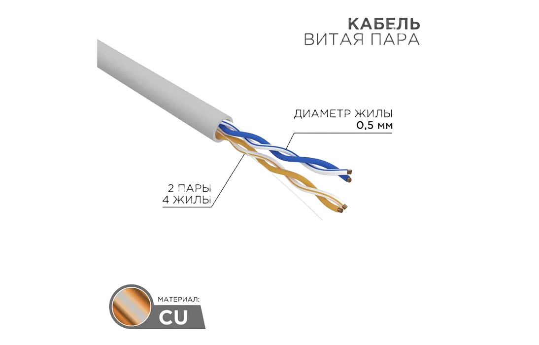 В основе кабеля лежат пары, образованные двумя токопроводящими медными проводниками, покрытыми изоляцией из ПВХ и скрученными между собой с определенным шагом навивки и защищенными внешней оболочкой.