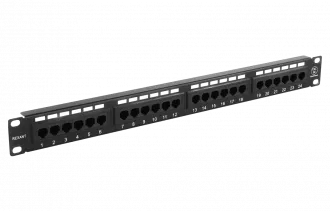 Представляет собой панель с множеством соединительных разъёмов – розеток RJ-45, расположенных на лицевой стороне панели и врезными контактами, расположенными на тыльной стороне панели, предназначенными для фиксированного соединения с витопарными кабелями.