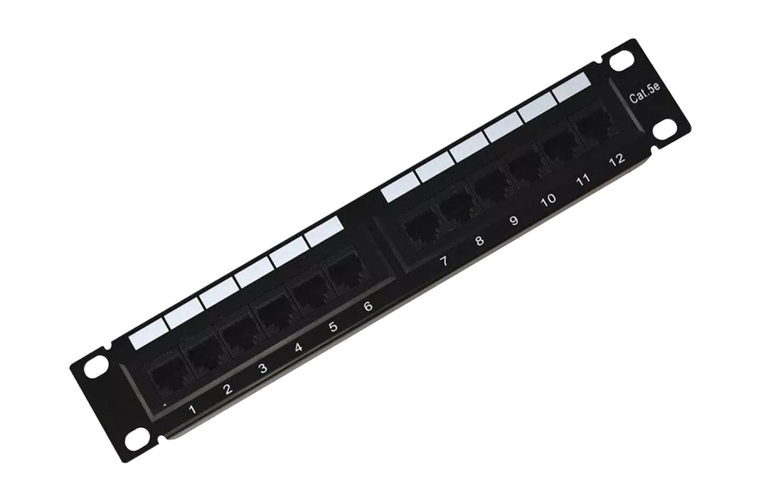Представляет собой панель с множеством соединительных разъёмов – розеток RJ-45, расположенных на лицевой стороне панели и врезными контактами, расположенными на тыльной стороне панели, предназначенными для фиксированного соединения с витопарными кабелями.