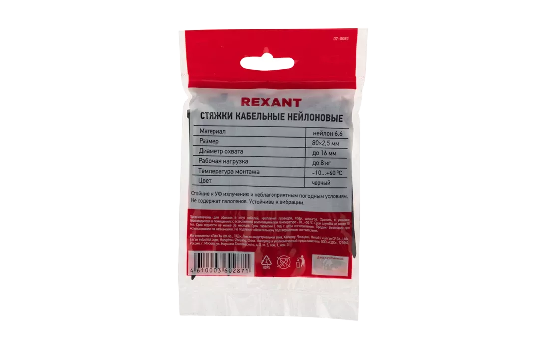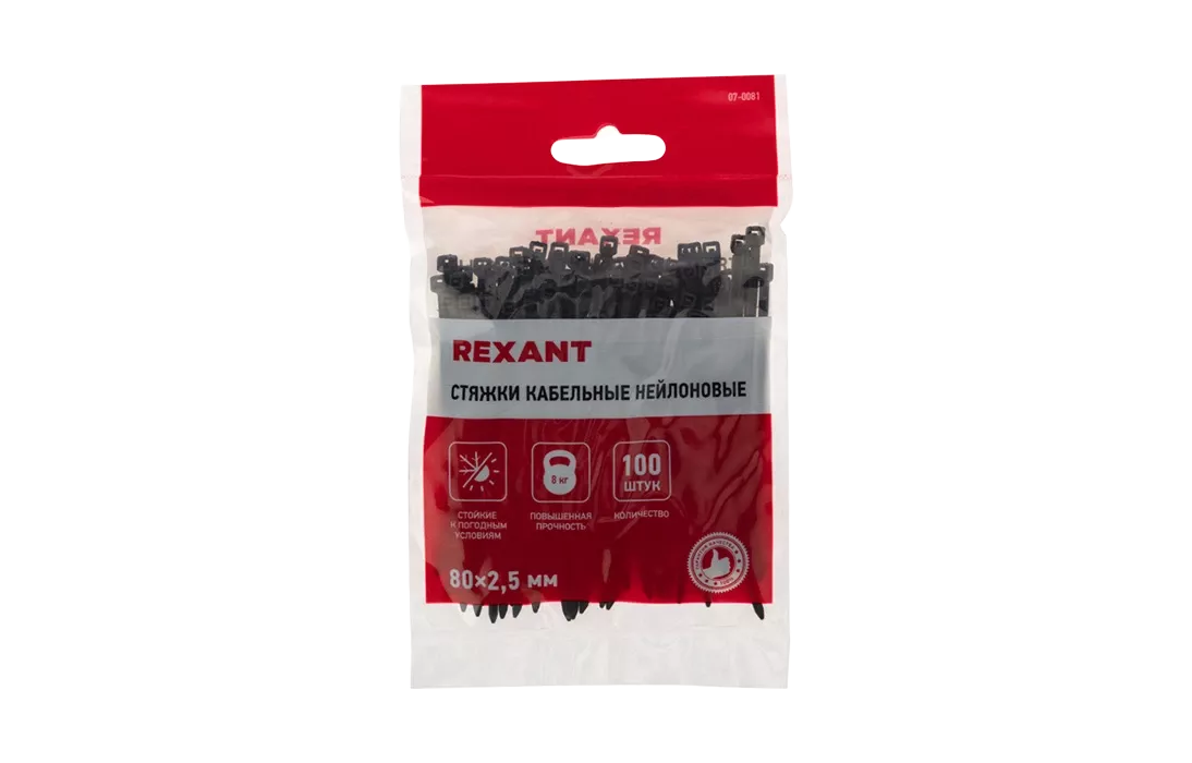 07-0081 Хомут-стяжка кабельная нейлоновая REXANT 80 x2,5 мм, черная, упаковка 100 шт.