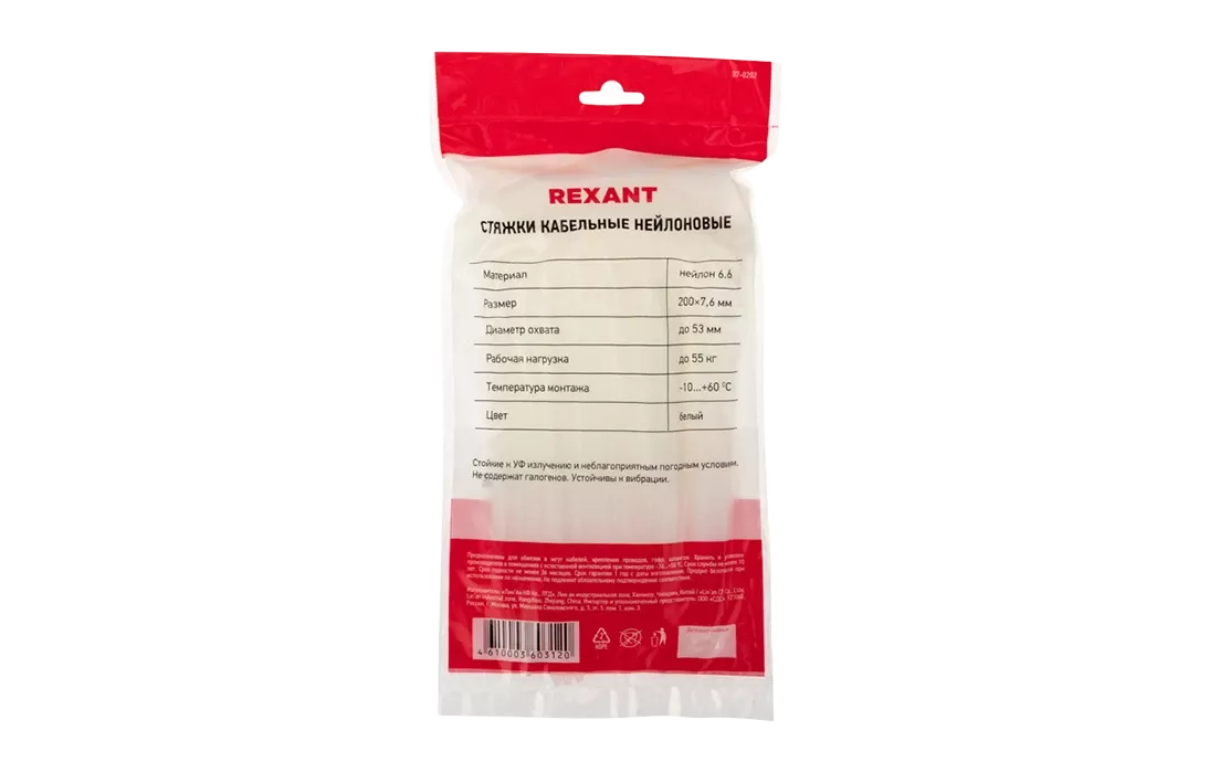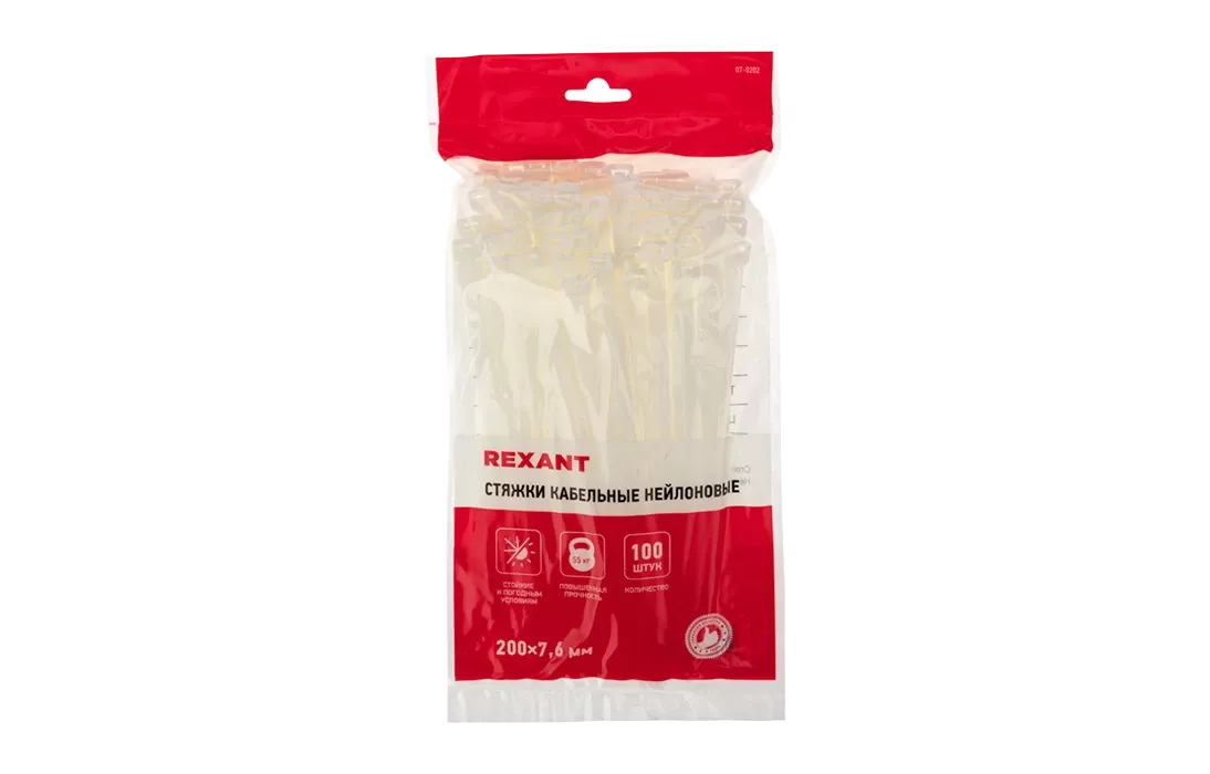 07-0202 Хомут-стяжка кабельная нейлоновая REXANT 200 x7,6 мм, белая, упаковка 100 шт.