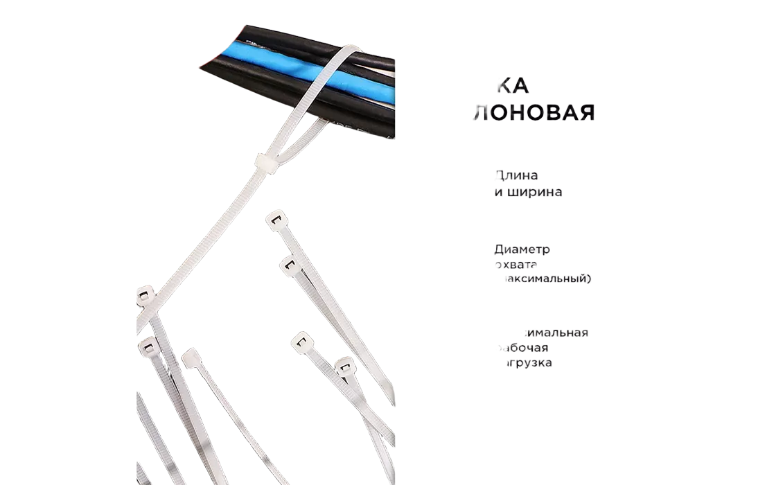 Представляет собой гибкую полоску из нейлона высокой прочности (полиамид-6,6) с замком на конце. Полиамид-6,6 — кристаллизующийся конструкционный материал, имеющий высокую твердость и механическую прочность, отличающийся высокими электроизоляционными свойствами. Имеет высокое сопротивление к основаниям, маслам, смазочным материалам, хлоридным растворителям. Не содержит галогенов.