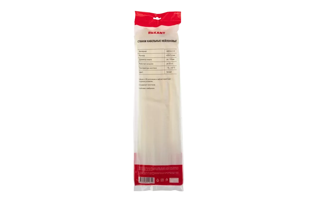 07-0450-8 Хомут-стяжка кабельная нейлоновая REXANT 450 x7,6 мм, белая, упаковка 100 шт.