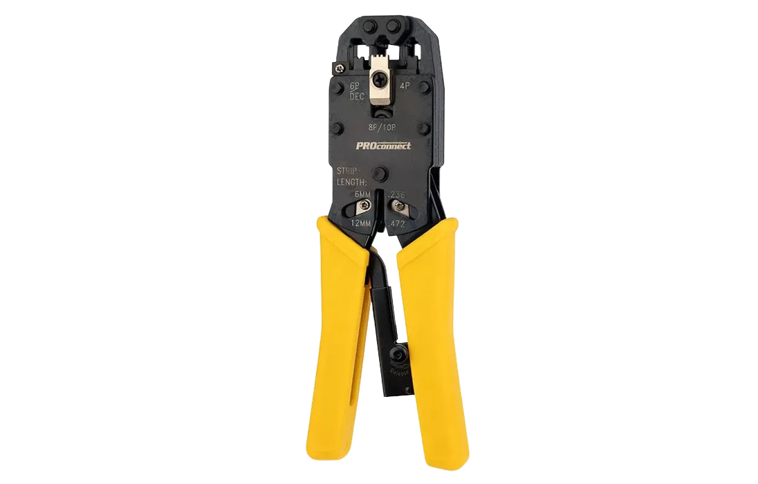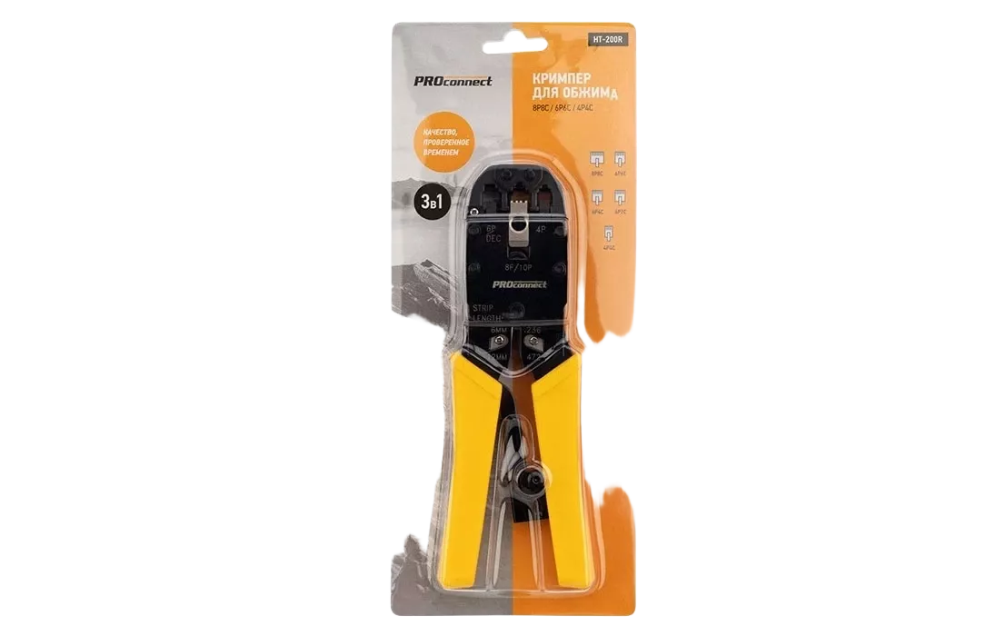 Кримпер PROconnect HT-200R — универсальный инструмент для обжима разъемов RJ-45 (8P8C), RJ-12 (6P6C), RJ-11 (6P4C и 6P2C) и RJ-10 (4P4C), а также для снятия изоляции и обрезки проводов.