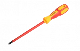 Стержень отвертки из высококачественной хромованадиевой стали с оксидированным намагниченным наконечником покрыт специальным изоляционным материалом.