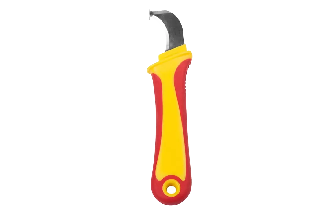 Нож монтажника предназначен для удаления изоляции с многожильного кабеля и других электромонтажных работ. Усиленное лезвие с прецизионной двухсторонней заточкой подходит для работы с толстыми материалами. Нож изготовлен из нержавеющей стали, благодаря чему защищен от коррозии и имеет продолжительный срок эксплуатации. Кончик ножа оснащен "пяткой" - ограничительной пластиной - для качественного снятия оболочки без риска повредить жильную изоляцию. Изогнутая форма лезвия делает нож удобным для работы в труднодоступных местах. Мощная противоскользящая двухкомпонентная рукоятка изготовлена из мягкого пластика и гарантирует комфорт и безопасность во время работы. Для удобного хранения и транспортировки ножа предусмотрены пластиковые ножны.