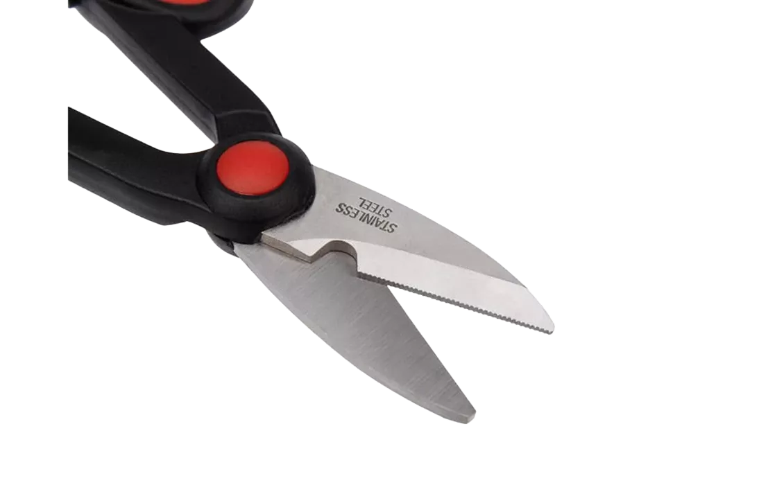 Универсальные ножницы предназначены для резки кожи, резины, картона, пластика, гофры, медных проводов, кабеля. Инструмент изготовлен из нержавеющей стали, благодаря чему защищен от коррозии и имеет продолжительный срок эксплуатации. Лезвия ножниц качественно заточены и обеспечивают аккуратный и точный рез. На одном из лезвий есть выемка, которая позволяет фиксировать провода и удерживать их на месте во время разрезания для большей точности и безопасности. Двухкомпонентные защитные рукоятки с резиновыми вставками не дают инструменту выскальзывать из руки при работе.