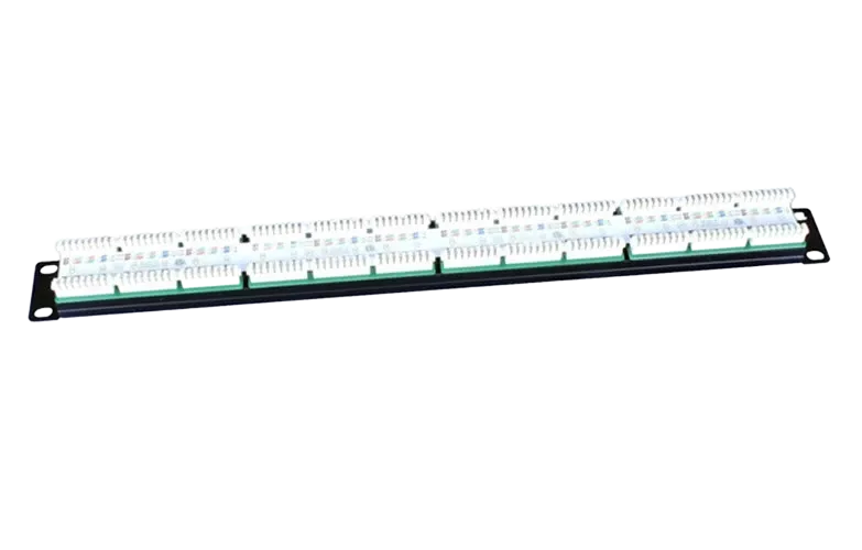 Представляет собой панель с множеством соединительных разъёмов – розеток RJ-45, расположенных на лицевой стороне панели и врезными контактами, расположенными на тыльной стороне панели, предназначенными для фиксированного соединения с витопарными кабелями.