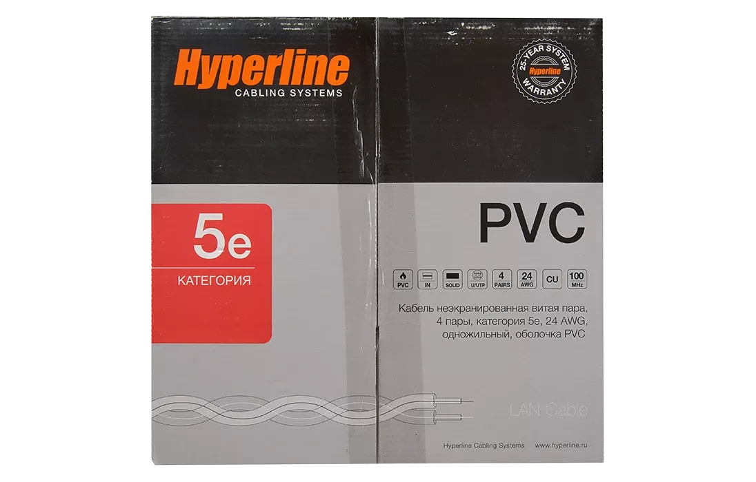 41903 Hyperline UUTP4-C5E-S24-IN-PVC-GY-305 (305 м) Кабель витая пара, неэкранированная U/UTP, категория 5e, 4 пары (24 AWG), одножильный (solid), PVC