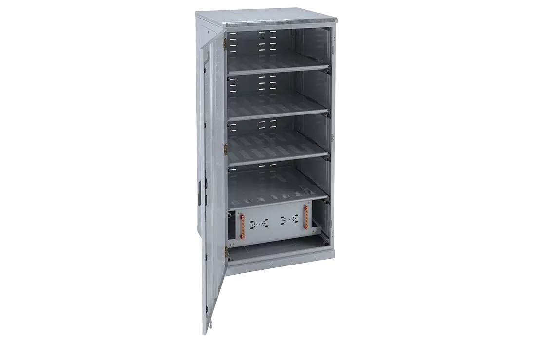 Дверь закрывается на ключ и предотвращает доступ посторонних лиц. Аккумуляторные батареи размещаются на полках и соединяются в последовательные линейки с помощью межбатарейных соединителей. Суммарное напряжение батарейной линейки может составлять 240-480 В. Подключение батарейного кабинета источником бесперебойного питания (ИБП) производится с помощью электрического кабеля требуемого сечения через дополнительный батарейный размыкатель. Рекомендуется использовать при установке систем ИБП в общедоступных местах (аппаратных помещениях, машинных залах, офисах), где существует вероятность поражения электрическим током при случайном соприкосновении с токоведущими частями.