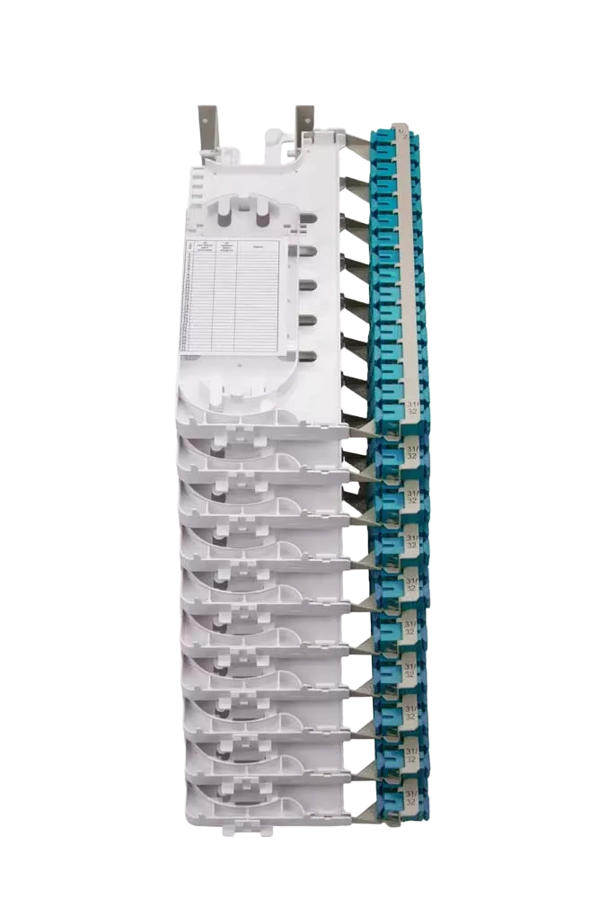 Конструктивной особенностью данного решения является монтаж и кросс-коммутация ОВ в откидных кроссовых модулях, объединенных в кроссовые блоки. Каждый модуль содержит кассету для укладки ОВ и панель с адаптерами (до 24 FC или 32 SC). В собранном состоянии модули размещаются в блоке вертикально, при этом адаптерные панели образуют кроссовое поле. При повороте модуля в горизонтальное положение обеспечивается удобный доступ к адаптерам и пигтейлам. Для монтажа модуль свободно снимается с блока за счет запаса длины транспортных трубок.