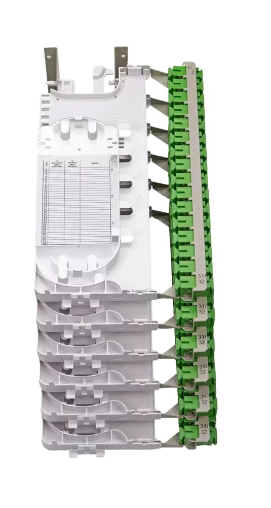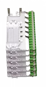 Конструктивной особенностью данного решения является монтаж и кросс-коммутация ОВ в откидных кроссовых модулях, объединенных в кроссовые блоки. Каждый модуль содержит кассету для укладки ОВ и панель с адаптерами (до 24 FC или 32 SC). В собранном состоянии модули размещаются в блоке вертикально, при этом адаптерные панели образуют кроссовое поле. При повороте модуля в горизонтальное положение обеспечивается удобный доступ к адаптерам и пигтейлам. Для монтажа модуль свободно снимается с блока за счет запаса длины транспортных трубок.