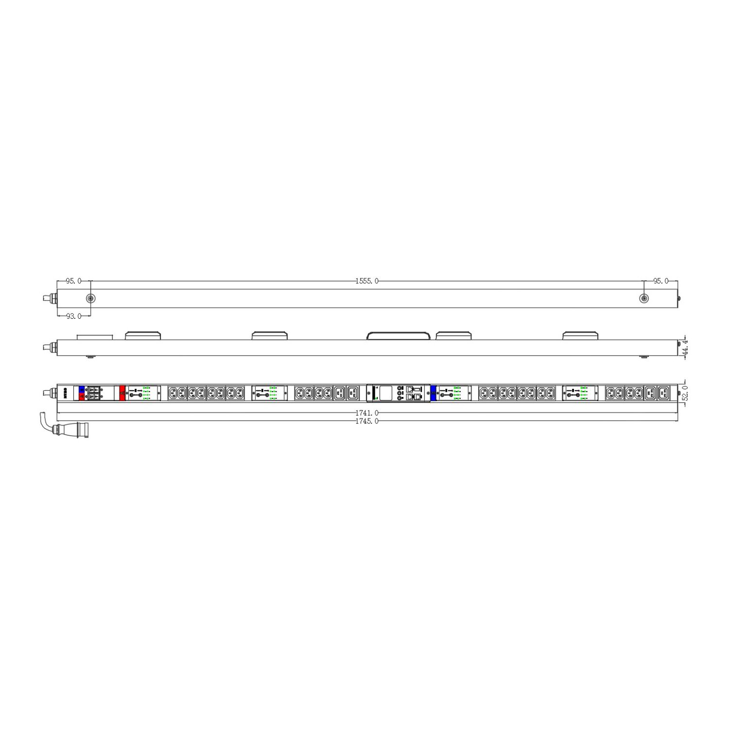 Блок распределения питания NTSS Managed, 1ф32А, 7.4кВт, 2 автоматических выключателя, (24)С13, (4)С19, 3м кабель с вилкой IEC 60309, 1760.5х65х65 мм