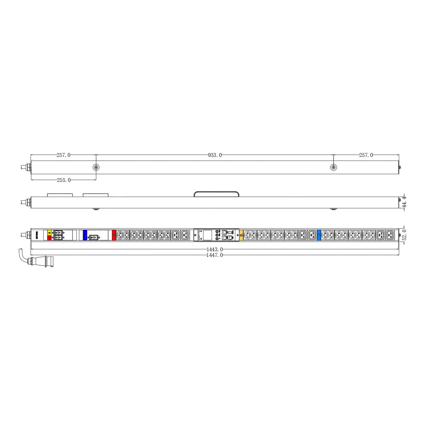 Блок распределения питания NTSS Metered, 3ф32А, 22кВт, 3 автоматических выключателей, (24)С13, (6)С19, 3м кабель с вилкой IEC 60309, 1724.5х52х44.4 мм