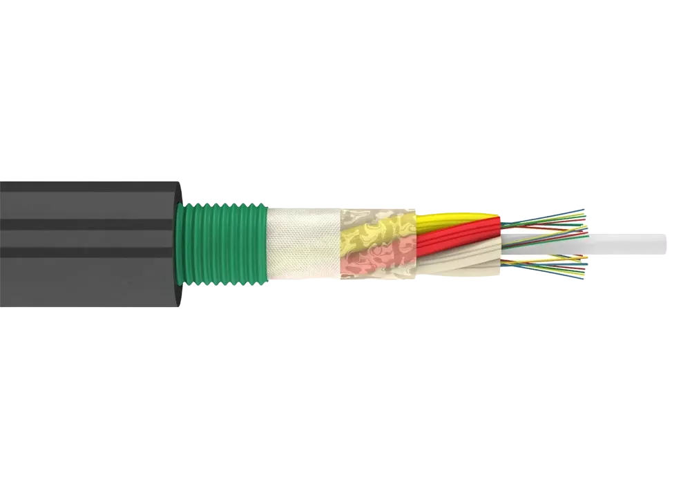 Повив оптических модулей вокруг стеклопластикового прутка защищен стальной гофрированной лентой и наружной полиэтиленовой оболочкой. Кабель имеет облегченную конструкцию (без промежуточной оболочки).