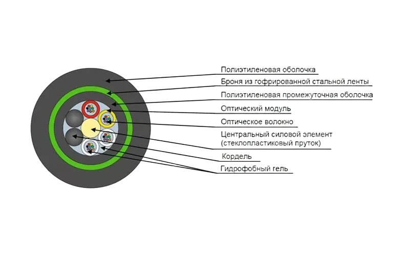 Конструктивно представляет собой повив оптических модулей вокруг стеклопластикового прутка, покрытый промежуточной полиэтиленовой оболочкой и защищенной стальной гофрированной лентой и наружной оболочкой из полиэтилена средней плотности. Свободное пространство в оптических модулях и в сердечнике кабеля заполнено гидрофобным гелем.