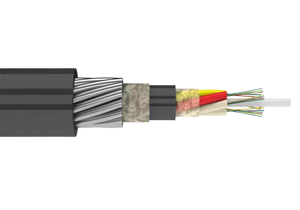Повив оптических модулей вокруг стеклопластикового прутка защищен промежуточной полиэтиленовой оболочкой, броней из стальных оцинкованных проволок и покрыт наружной оболочкой из полимерного материала.