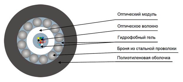 Конструктивно представляет собой центральный оптический модуль, защищенный броней из стальных оцинкованных проволок и наружной оболочкой из полиэтилена средней плотности. Свободное пространство в оптическом модуле и между стальными проволоками заполнено гидрофобным гелем.