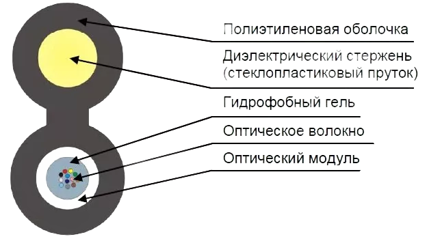 Центральный оптический модуль защищен наружной оболочкой из полимерного материала. Кабель имеет выносной силовой элемент, выполненный из стеклопластика покрытого полимерной оболочкой.
