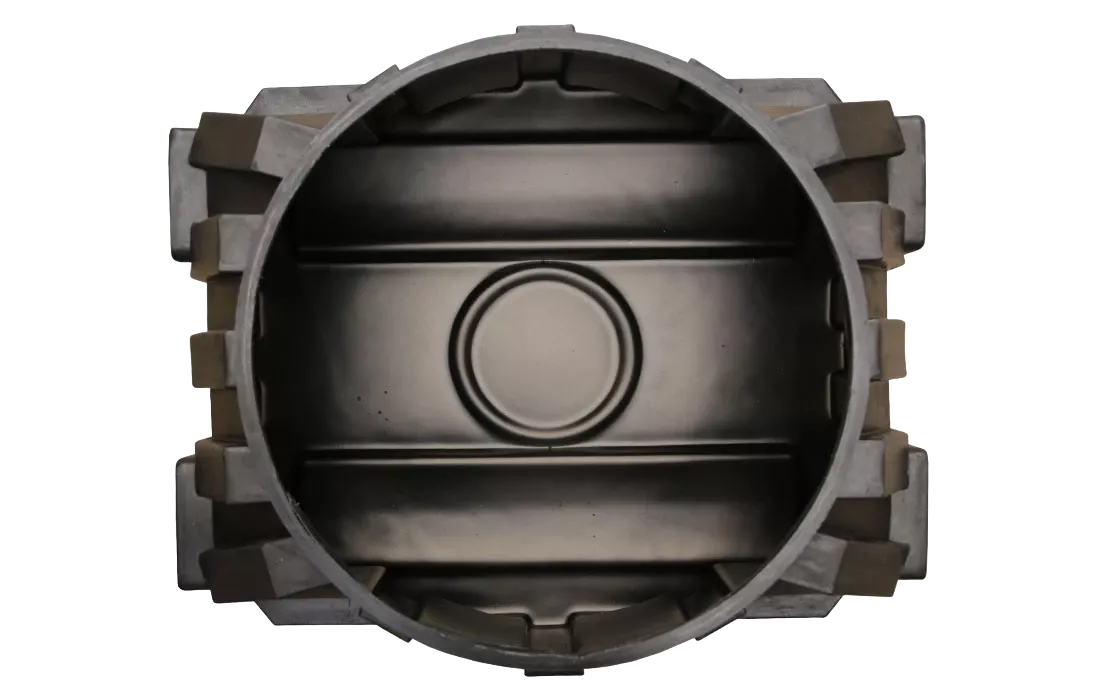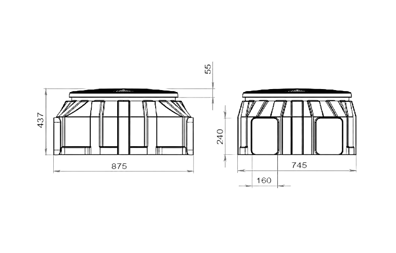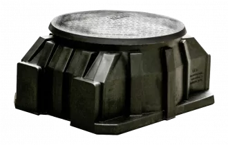 Камера имеет в сечении форму обратного конуса и состоит из двух цельнолитых элементов – крышки и корпуса. Такая форма препятствует выталкиванию устройства из грунта при его выпучивании или подвижке. На каждом из четырех углов корпуса находится по одной плоской присоединительной площадке, через которые можно ввести трубы диаметром до 125 мм.