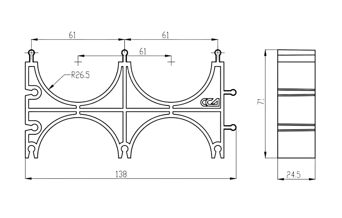Кластер представляет собой решетчатое изделие с ложементами для укладки труб, выполненное из пластика. На корпусе кластера имеются специальные выступы и пазы для соединения нескольких кластеров в единый блок при прокладке большего количества каналов.