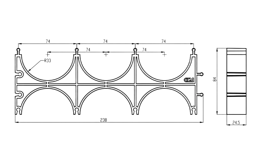 Кластер представляет собой решетчатое изделие с ложементами для укладки труб, выполненное из пластика. На корпусе кластера имеются специальные выступы и пазы для соединения нескольких кластеров в единый блок при прокладке большего количества каналов.