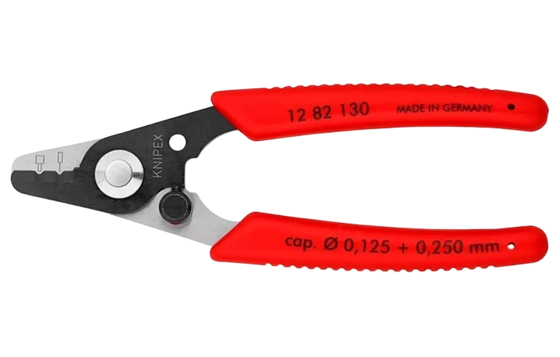 KN-1282130SB Стриппер Knipex для снятия изоляции с оптического волокна. Для удаления первичной и вторичной оболочки с оптоволоконных кабелей. Хромованадиевая электросталь особого качества, закалённая в масле.