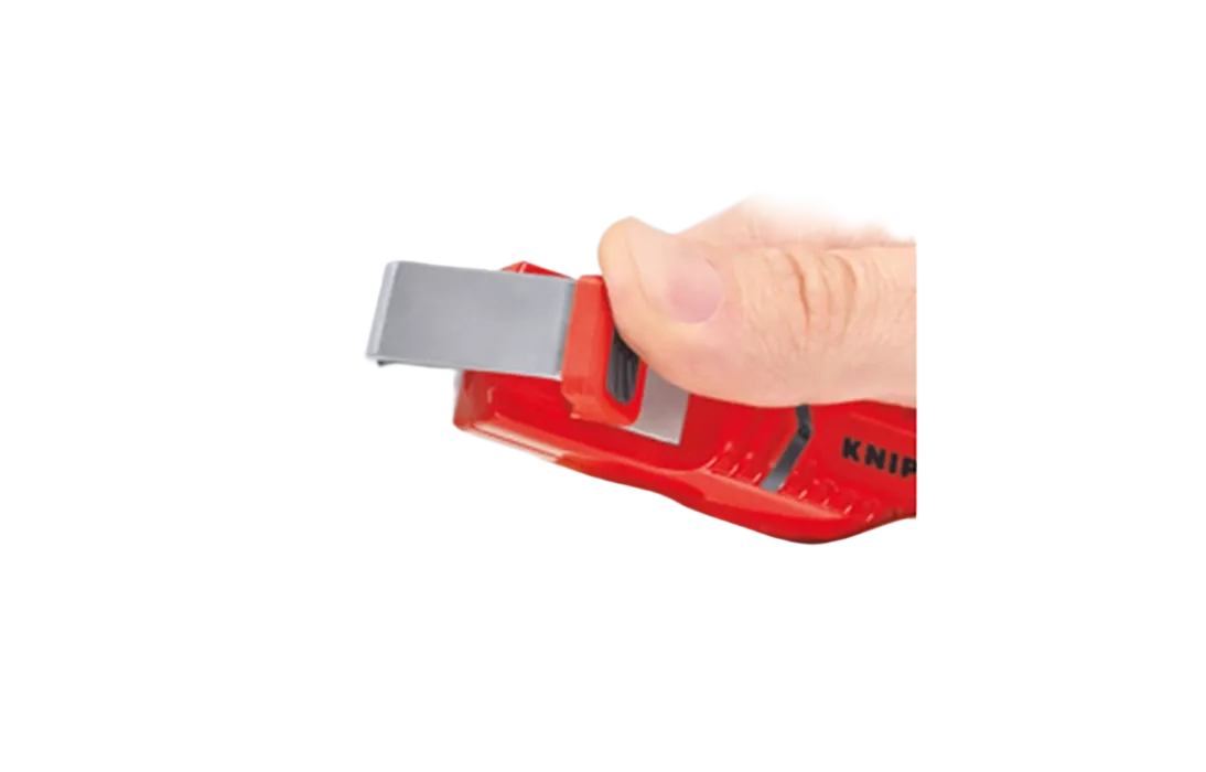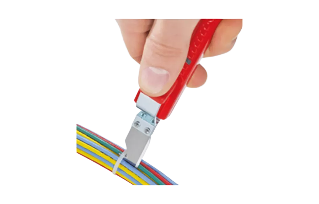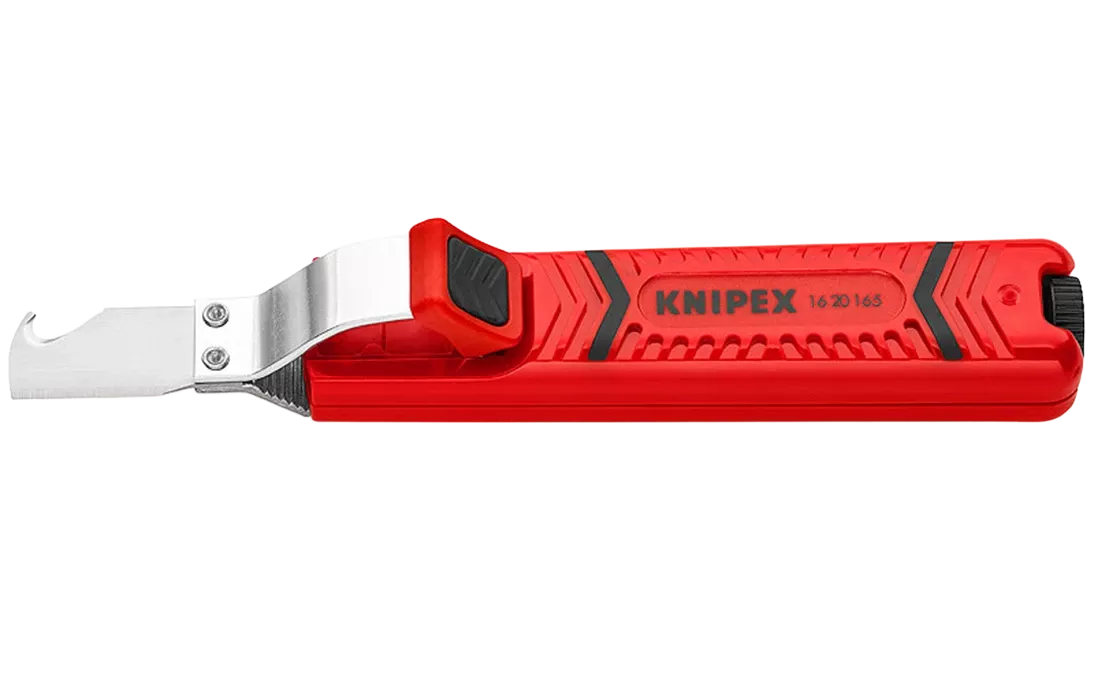 16 20 165 SB Стриппер для удаления оболочек всех распространенных круглых кабелей. Конструкция имеет самораскрывающуюся упорную скобу, настройку глубины резания установочным винтом, вращающееся лезвие для резов по окружности и продольных резов, сменное лезвие в корпусе инструмента, надежное удержание благодаря мягким вставкам на ручках и на фиксаторе, предотвращающим скольжение руки, нож с прямым лезвием и лезвием-крючком. Инструмент имеет диапазон рабочих диаметров от Ø 8,0 до 28,0mm
