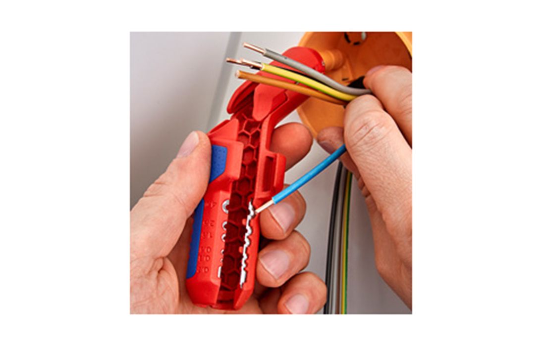 16 95 02 SB KNIPEX ErgoStrip® Для быстрого и точного удаления изоляции с наиболее часто применяемых круглых проводов и проводов для сырых помещений (например, NYM от 3 x 1,5 мм² до 5 x 2,5 мм²), дата-кабеля (витой пары) и коаксиального кабеля. Инновационный, эргономичный дизайн ручки пистолетной формы для лёгкого снятия и продольного реза изоляции. Оформленный конусом край инструмента для лучшего доступа к проводам в узком пространстве. Возможность удаления изоляции сечений 0,2 / 0,3 / 0,8 / 1,5 / 2,5 / 4 мм². Легкий ввод провода для удаления изоляции благодаря направляющим буртикам. С раскрывающей пружиной и замком. Удобная укладка коаксиального и дата-кабеля благодаря конструкции инструмента. Многокомпонентные рукоятки с зоной из мягкого пластика для удобной работы и надежного хвата. Для левшей.