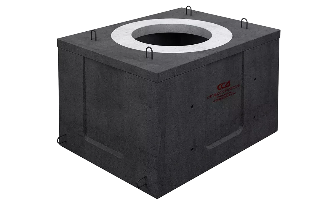 Колодец имеет в сечении прямоугольную форму и состоит из двух элементов – корпуса и плиты перекрытия с круглым отверстием диаметром 600 мм для формирования горловины с люком. В основании корпуса колодца с внутренней стороны расположена прямоугольная ниша. При необходимости, ее стенку вырезают для создания дренажа. На наружных поверхностях торцевых и боковых стен расположены глухие ниши, в пределах которых можно проделывать (высверливать) отверстия в тех местах, в которых к колодцу подходит труба.