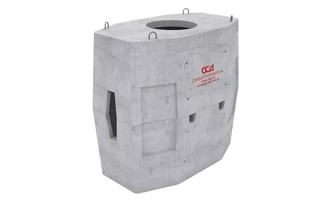 Колодец имеет в сечении восьмиугольную форму и состоит из двух элементов – верхней и нижней половин. На элементах колодца имеются петли для строповки при погрузке и разгрузке их с автомобиля, а также для опускания в котлован. Перекрытие верхнего элемента дополнительно армировано и содержит круглое отверстие диаметром 600 мм для формирования горловины с люком. В основании нижней половины колодца с внутренней стороны расположена прямоугольная ниша. При необходимости, ее стенку вырезают для создания дренажа. На внутренних поверхностях торцевых стенок элементов колодца имеются ниши. В центре ниш расположены технологические отверстия для ввода двух труб с внутренним диаметром 100 мм. Для ввода и вывода каналов на наружных поверхностях боковых стенок колодца расположены по две ниши, с каждой из сторон.