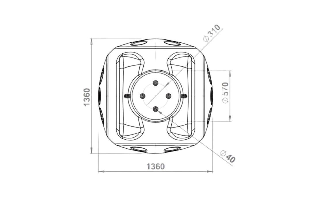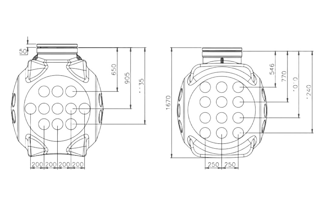 Представляет собой цельнолитое изделие шарообразной формы, без сварных швов, обеспечивающих его герметичность. Корпус колодца имеет ребра жесткости для придания ему повышенной прочности. С четырех сторон, на стенках колодца имеются специально сформированные контуры для ввода гладкостенных и гофрированных труб. Каждая стенка содержит по 6-ть таких контуров диаметром 170 мм.