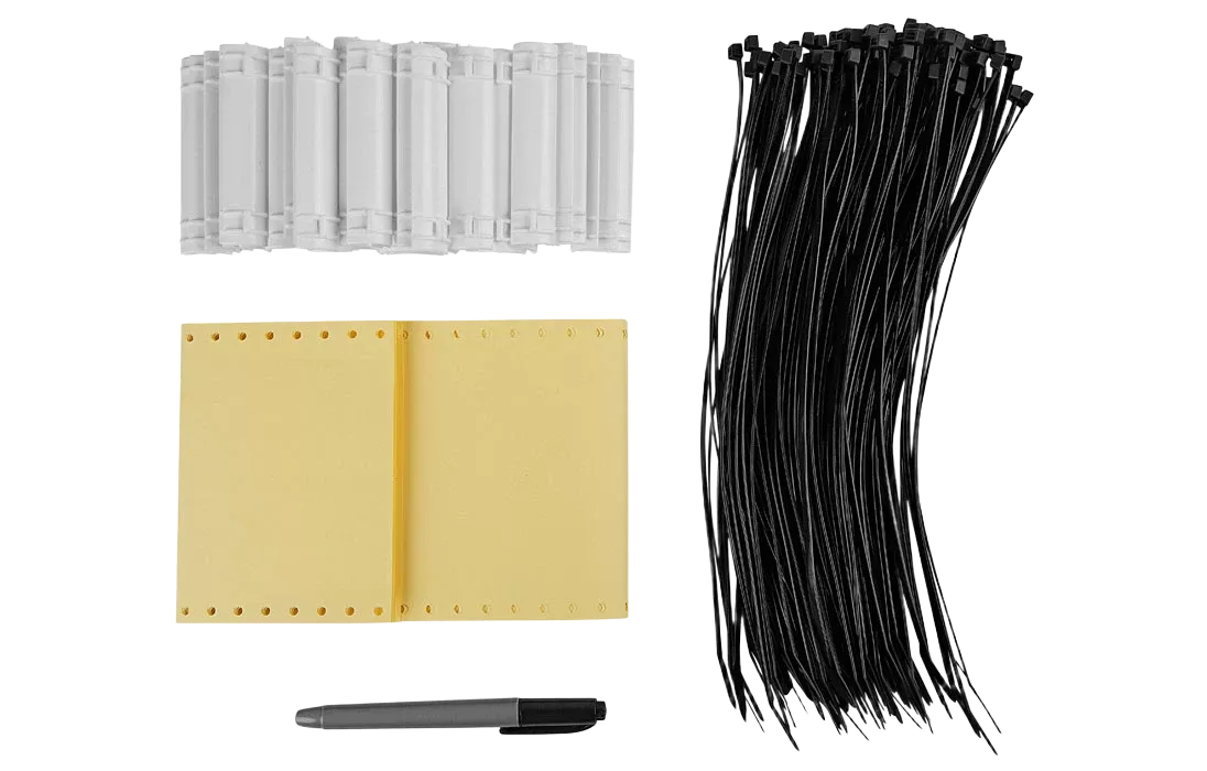 Поставляется наборами, состоящими из 20 пластмассовых бирок с проушинами, 20 самоламинирующихся маркеров для надписей, 40 пластмассовых стяжек длинной 250 мм и маркер-ручки перманентной для нанесения надписей.