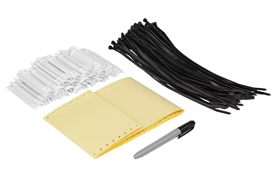 Поставляется наборами, состоящими из 50 пластмассовых бирок с проушинами, 50 самоламинирующихся маркеров для надписей, 100 пластмассовых стяжек длинной 250 мм и маркер-ручки перманентной для нанесения надписей.