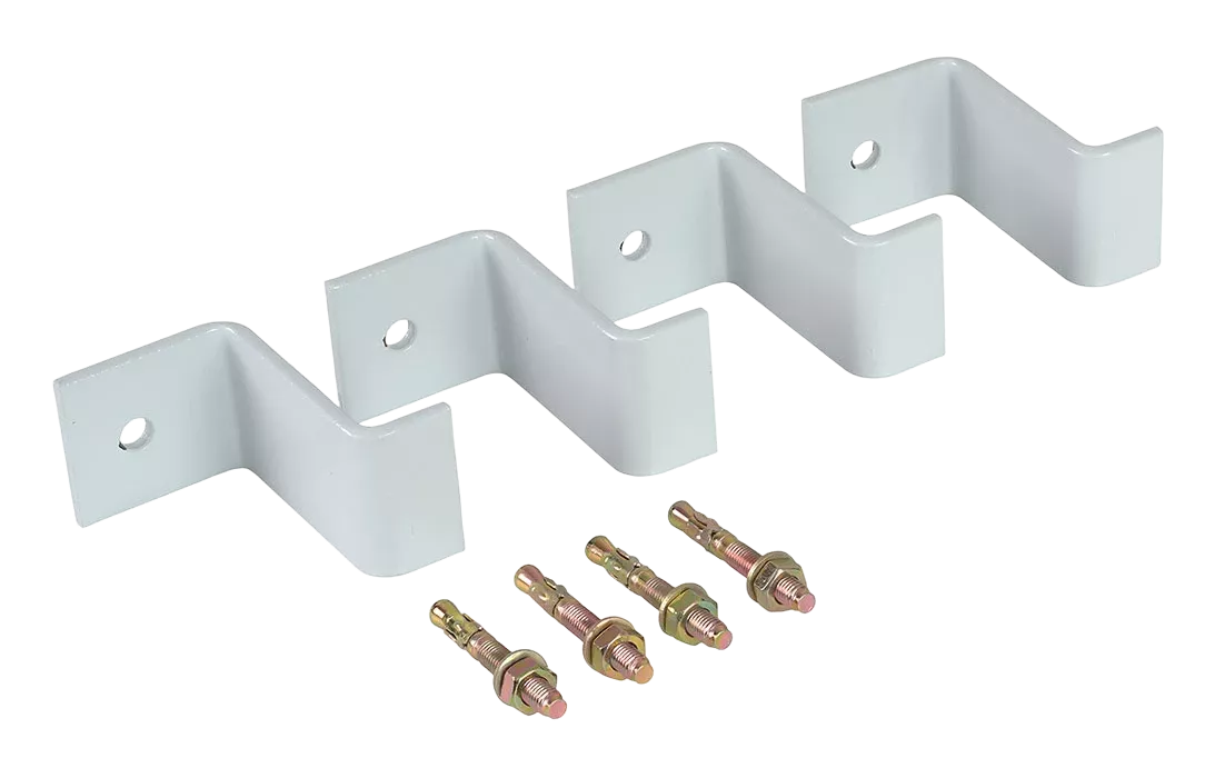 Комплект состоит из 4 металлических скоб с отверстиями, специальным образом изогнутых по форме дна камеры, а также 4 клиновых анкеров для фиксации КОТ-3 к основанию. Скобы покрыты порошковой краской.