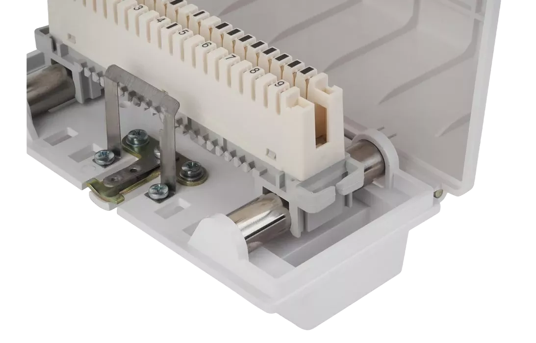 Конструкция узла крепления кабелей в коробках при необходимости обеспечивает надежный электрический контакт с экраном входящего распределительного кабеля, что облегчает его заземление. Ввод кабелей осуществляется через вырез в крышке, что упрощает монтаж и позволяет использовать для абонентской разводки не только провода ТРП/ТРВ, но и четырехпарные кабели типа UTP/FTP.