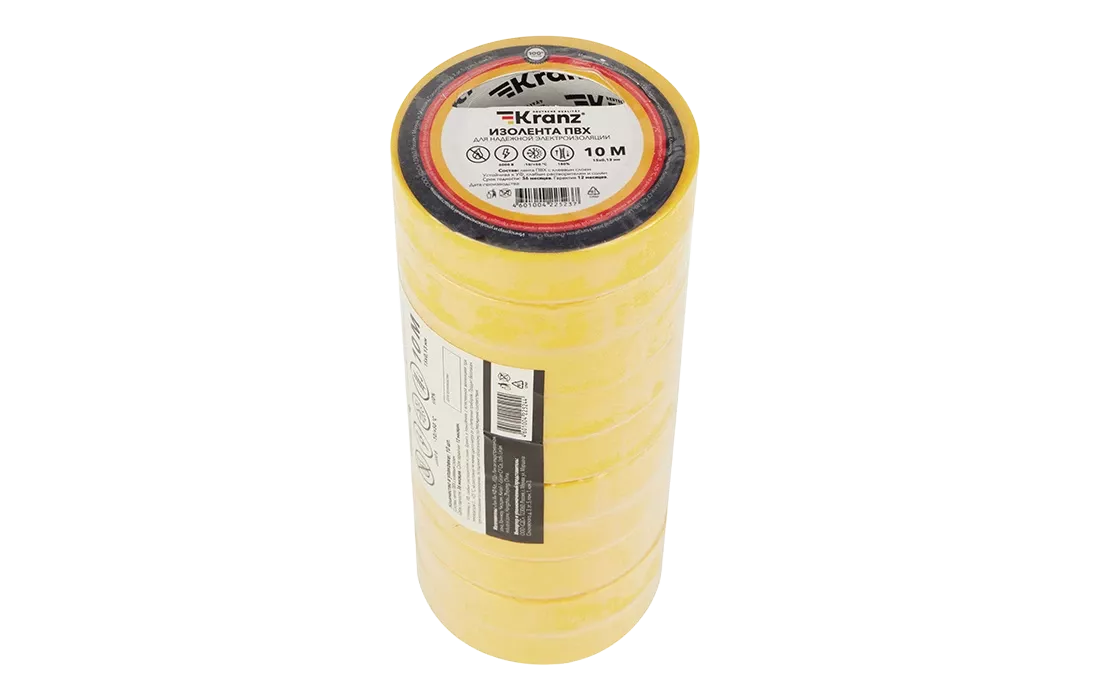 KR-09-2002 Изолента ПВХ KRANZ 0.13х15 мм, 10 м, желтая упаковка 10 роликов