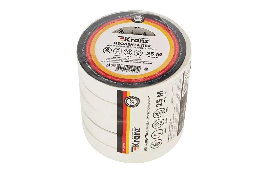 Изолента KRANZ предназначена для электрической изоляции, цветной маркировки, соединения, защиты от внешних факторов и герметизации кабелей, проводов и шнуров.