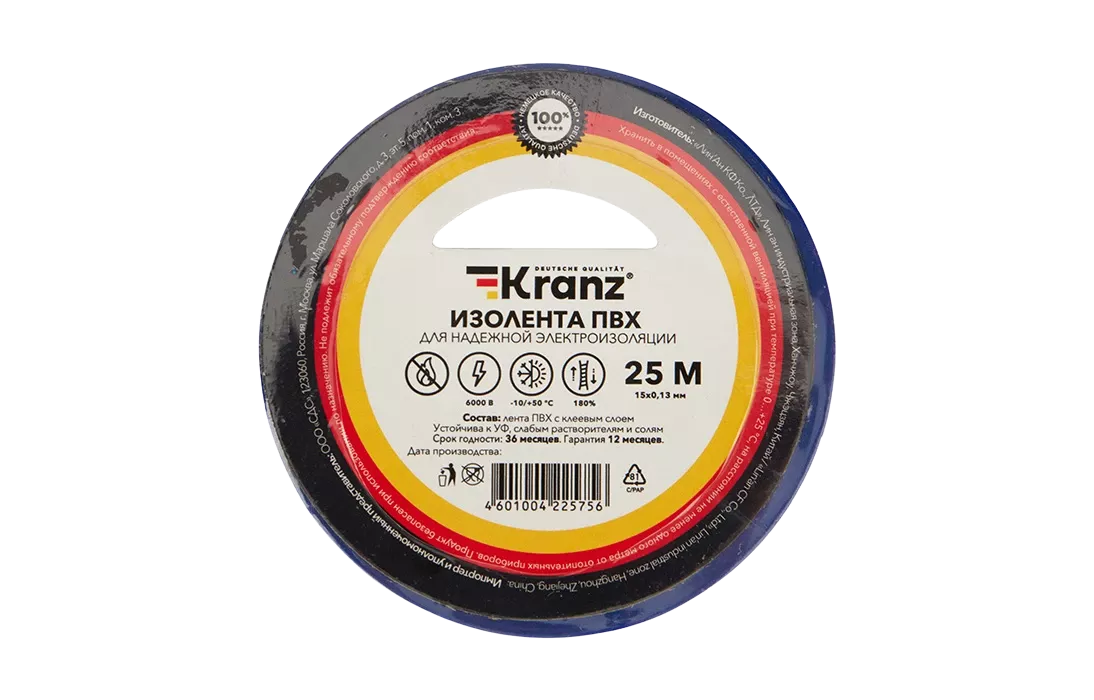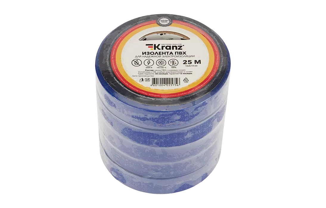 Изолента KRANZ предназначена для электрической изоляции, цветной маркировки, соединения, защиты от внешних факторов и герметизации кабелей, проводов и шнуров.