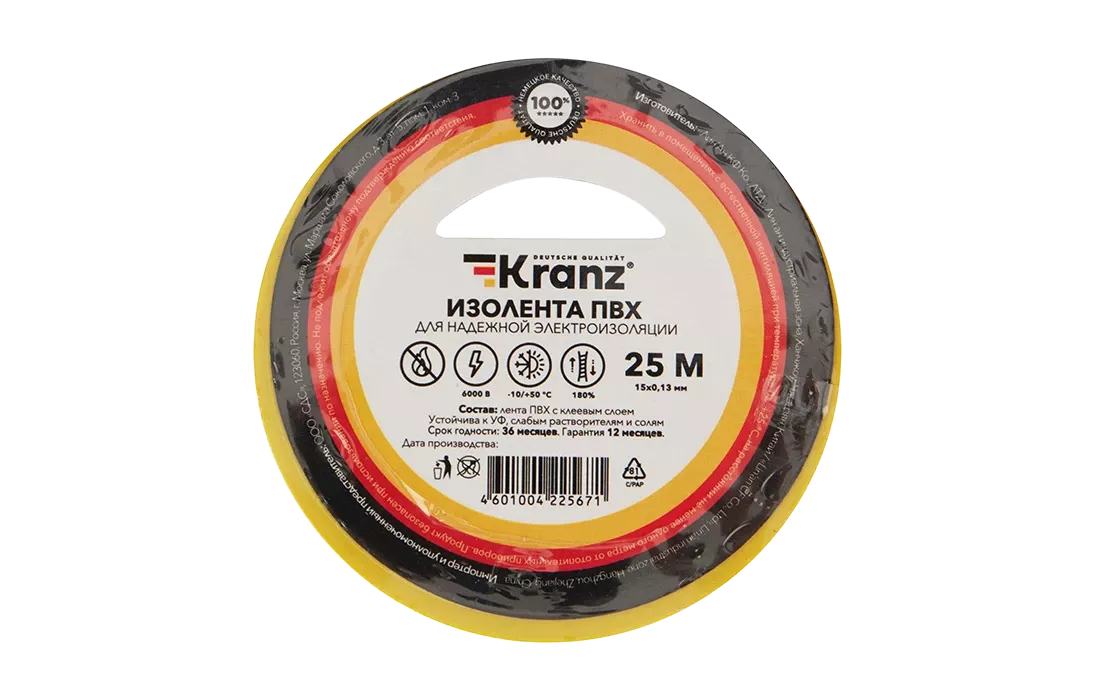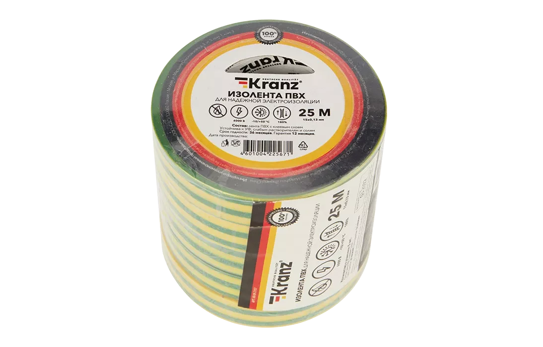 Изолента KRANZ предназначена для электрической изоляции, цветной маркировки, соединения, защиты от внешних факторов и герметизации кабелей, проводов и шнуров.