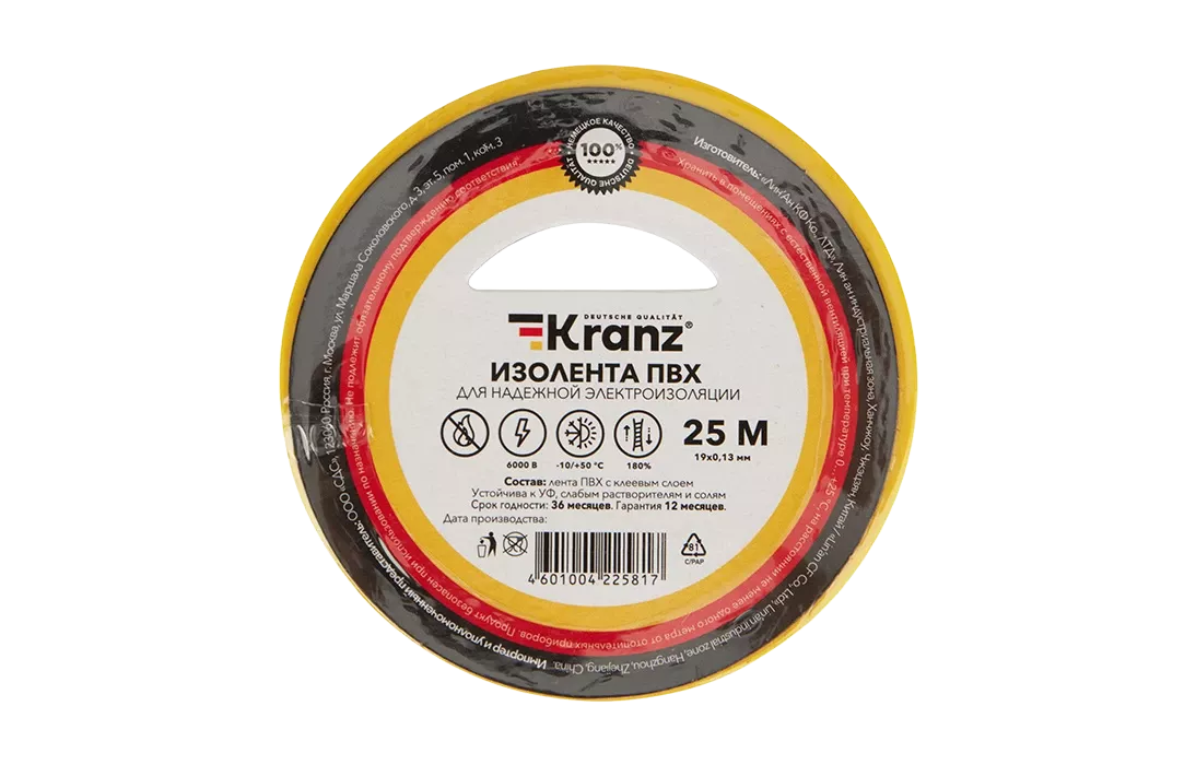 Изолента KRANZ предназначена для электрической изоляции, цветной маркировки, соединения, защиты от внешних факторов и герметизации кабелей, проводов и шнуров.