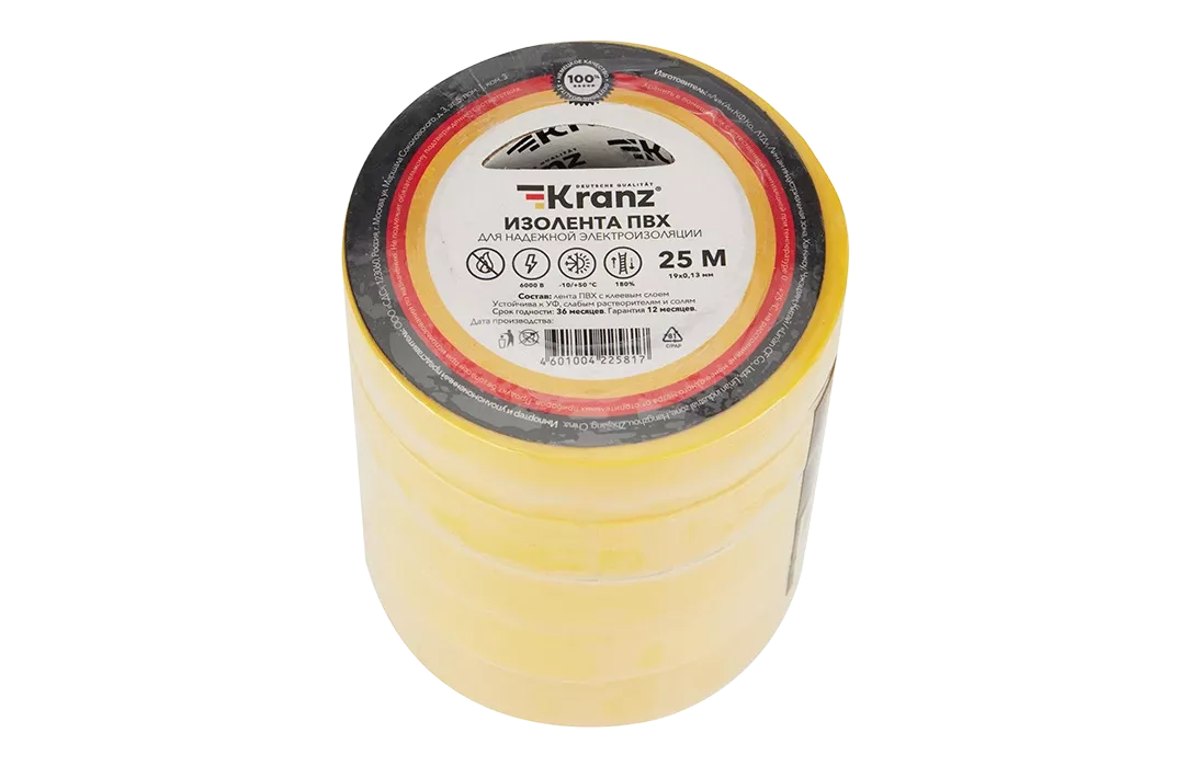 KR-09-2202 Изолента ПВХ KRANZ 19 мм х 25 м, желтая, упаковка 5 роликов