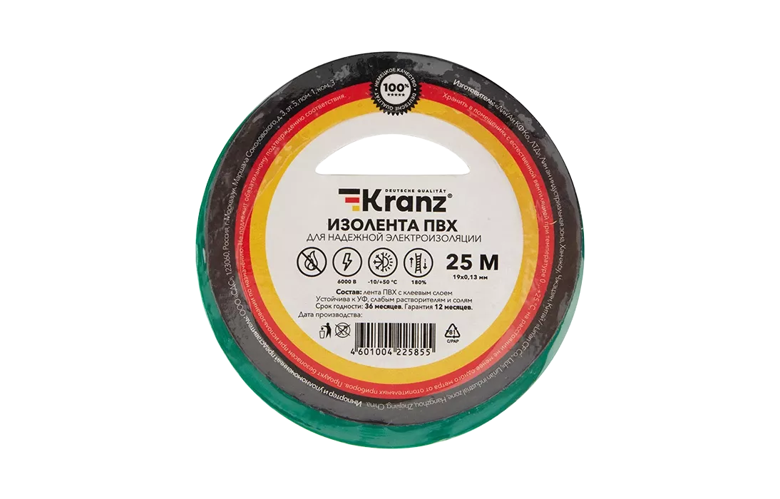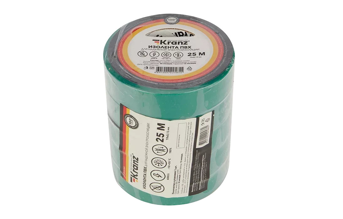 KR-09-2203 Изолента ПВХ KRANZ 0.13х19 мм, 25 м, зеленая упаковка 5 роликов