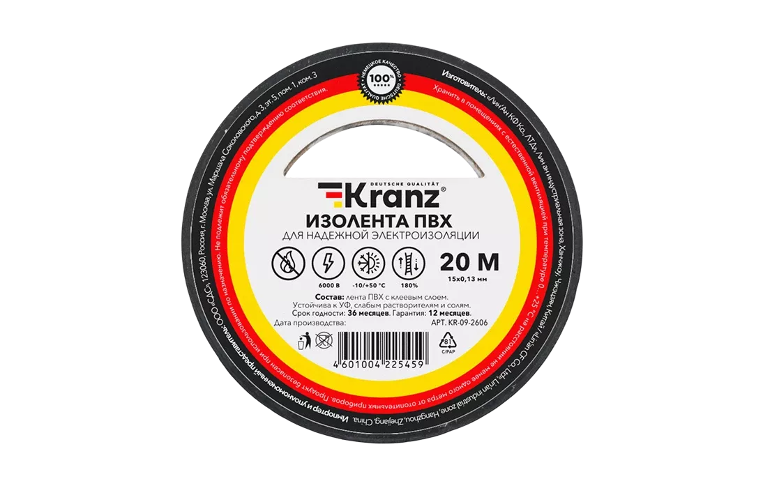 Изолента KRANZ предназначена для электрической изоляции, цветной маркировки, соединения, защиты от внешних факторов и герметизации кабелей, проводов и шнуров.