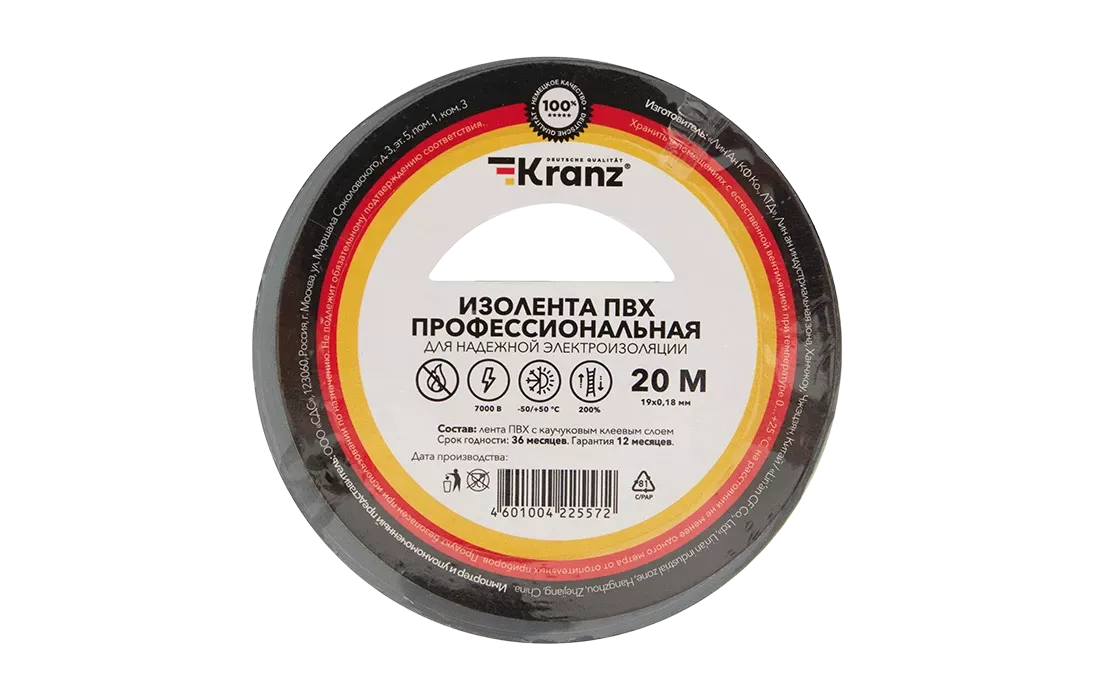 Профессиональная изоляционная лента KRANZ класса PREMIUM используется для электрической изоляции, цветной маркировки, соединения, защиты от внешних факторов и герметизации кабелей, проводов и шнуров.