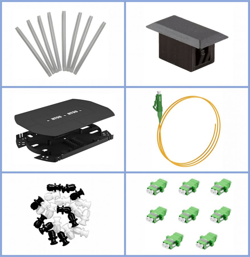 Кросс NTSS оптический 19'' укомплектованный 1U, 8 портов LC/APC duplex, 9/125 мкм (планки, сплайс-кассета, пигтейлы, КДЗС, адаптеры) черный RAL 9005