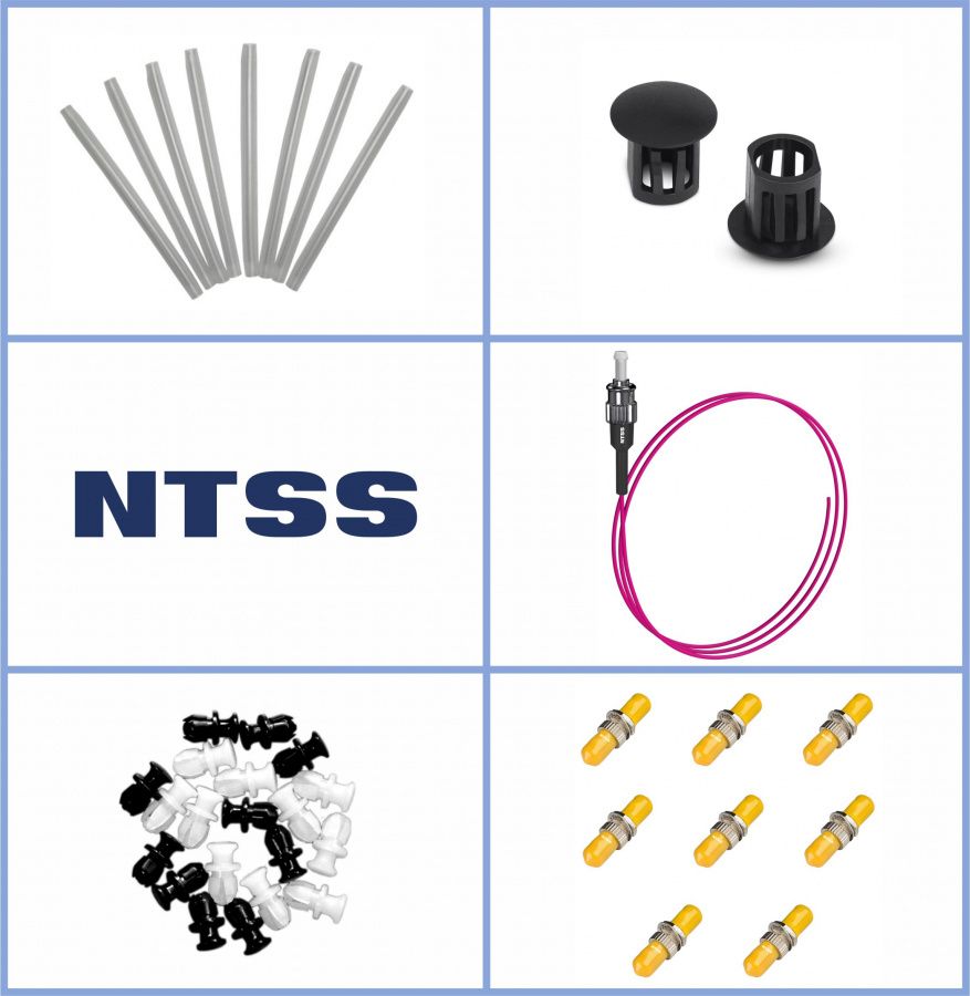 Кросс NTSS оптический настенный Мини, укомплектованный, 4 порта ST/UPC, 50/125 мкм ОМ4 (планка, ложемент, пигтейлы, КДЗС, адаптеры) серый RAL 7035