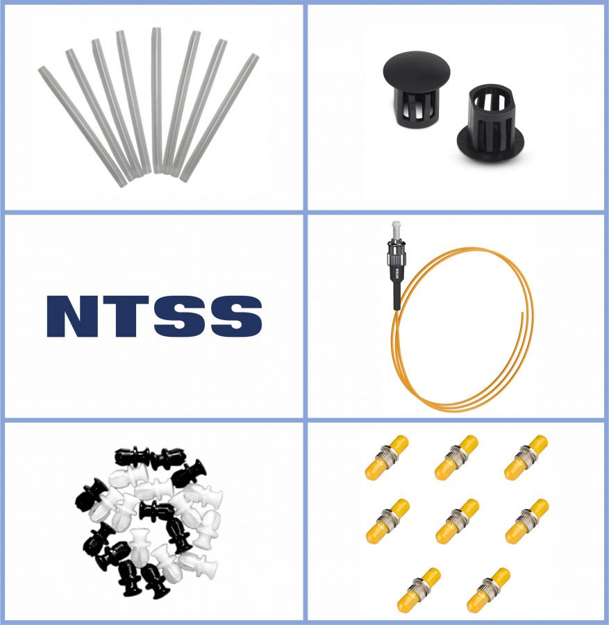 Кросс NTSS оптический настенный Мини, укомплектованный, 4 порта ST/UPC, 9/125 мкм (планка, ложемент, пигтейлы, КДЗС, адаптеры) серый RAL 7035