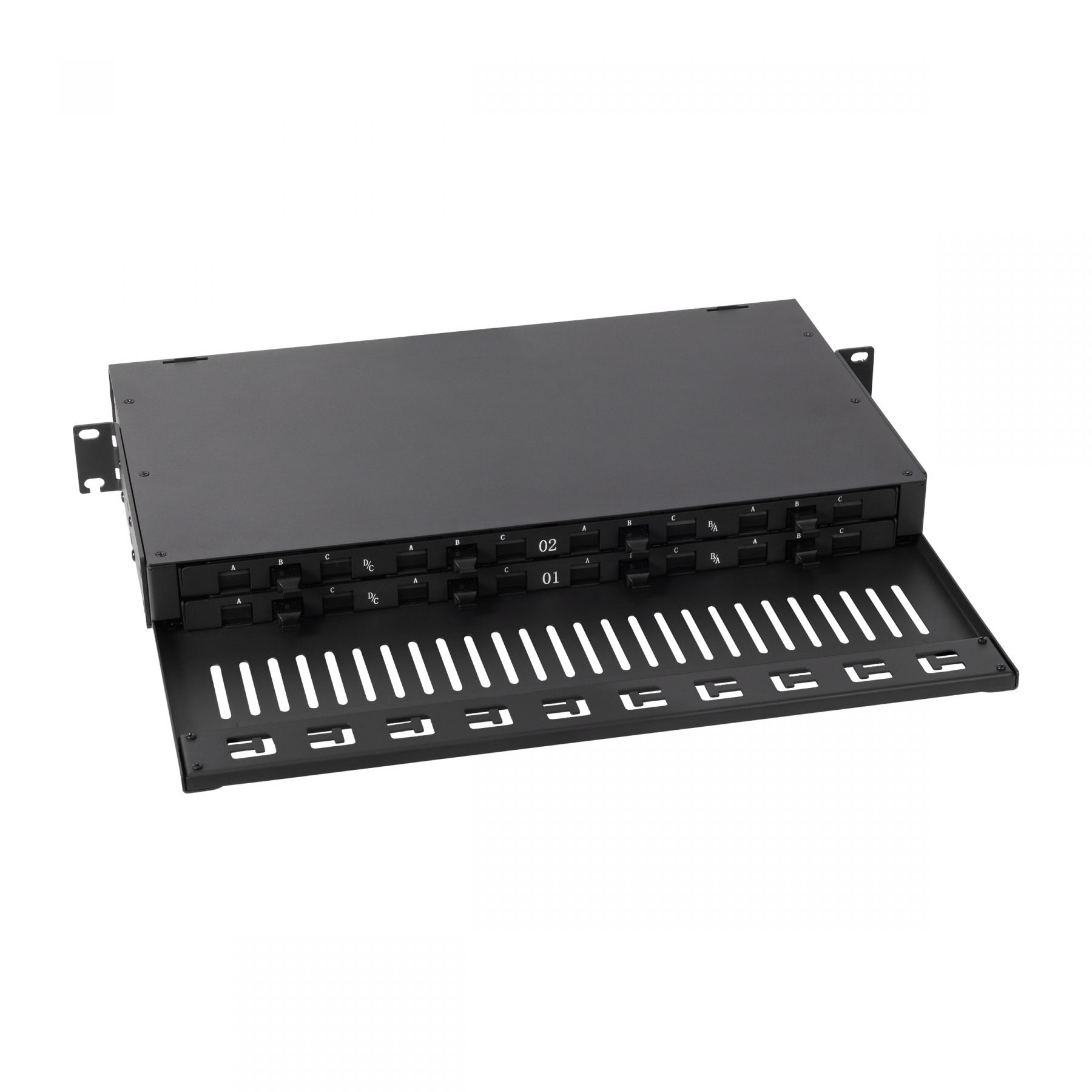 - Кросс имеет 2 уровня выдвижных салазок, каждая из которых предназначена для установки до 4 претерминированных кассет (всего 8 кассет на кросс высотою в 1 юнит), а также переднюю откидную крышку.