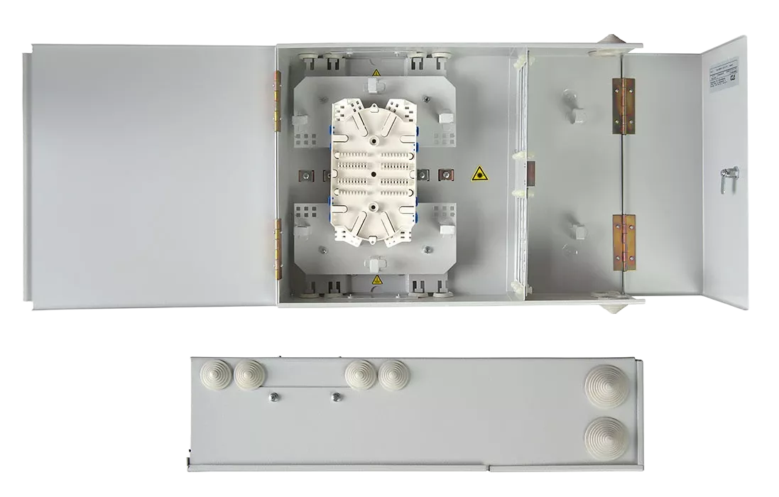 Оптические кабели разделываются и фиксируются в зоне ввода. Далее волокна в модулях поступают на кассеты для сварки с пигтейлами.